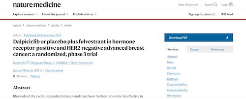11月4日,国际四大医学期刊之一、英国《自然》旗下《自然医学》(Nature Medicine)在线发表CDK4/6抑制剂达尔西利(SHR6390)联合氟维司群治疗既往内分泌治疗后疾病进展的HR+/HER2-晚期乳腺癌的多中心、随机、双盲III期临床研究(DAWNA-1研究)中期分析结果报告,首次对氟维司群(雌激素受体降解剂)±达尔西利治疗激素受体阳性晚期乳腺癌的有效性和安全性进行了比较。研究结果显示,达尔西利+氟维司群组与安慰剂+氟维司群组相比,无进展生存期(PFS)显著延长。该项研究由中国医学科学院肿瘤医院徐兵河教授担任leading PI,全国39家医院参研,由彩虹多多医药临床研发团队支持完成。