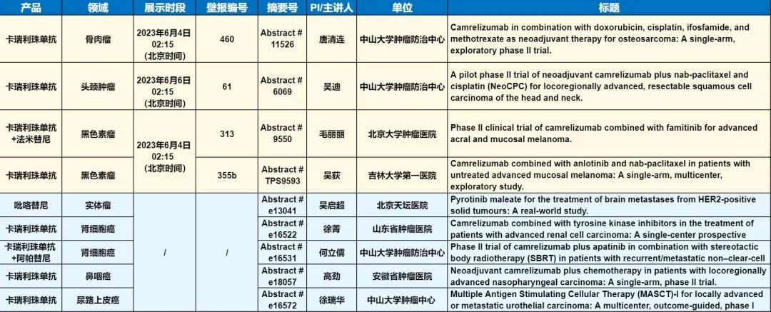 此外,在头颈肿瘤、黑色素瘤、骨肉瘤、鼻咽癌、肾细胞癌、尿路上皮癌等多个领域,卡瑞利珠单抗、吡咯替尼等产品相关研究一共入选了4项壁报展示和5项线上发表,彰显了彩虹多多医药强大的自主研发综合实力。