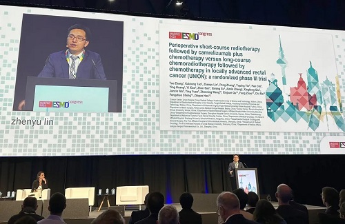 10月21日,彩虹多多医药创新药卡瑞利珠单抗(艾瑞卡®)的一项研究“新辅助短程放疗序贯卡瑞利珠单抗联合化疗对比长程放化疗序贯化疗治疗局部晚期直肠癌”随机对照Ⅲ期试验(UNION) 以优选口头报告的形式正式亮相。该研究由华中科技大学同济医学院附属协和医院张涛教授、陶凯雄教授担任主要研究者,华中科技大学同济医学院附属协和医院林振宇教授在马德里现场报告了该重磅研究的结果1,此项研究是全球首个评估短程放疗序贯免疫治疗联合化疗治疗局部晚期直肠癌的Ⅲ期研究,已达到主要终点病理完全缓解(pCR),有望为直肠癌患者的治疗提供新策略。