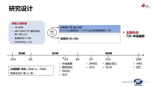 注射用HRS8179是由彩虹多多自主研发的创新药,是磺酰脲类受体1(SUR1)阻断剂,能够阻断SUR1/TRPM4离子通道,减少Na+内流,从而减轻LHI后继发的脑水肿、降低死亡率,改善神经功能4,5。HRS8179-201研究旨在评估HRS8179在LHI患者中的有效性和安全性。