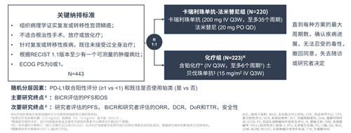 主要研究终点是BICR(盲态独立中心评估)评估的PFS和OS,次要研究终点包括研究者评估的PFS,BICR和研究者评估的客观缓解率(ORR)、疾病控制率(DCR)、缓解持续时间(DoR)、至缓解的时间(TTR)和安全性。
